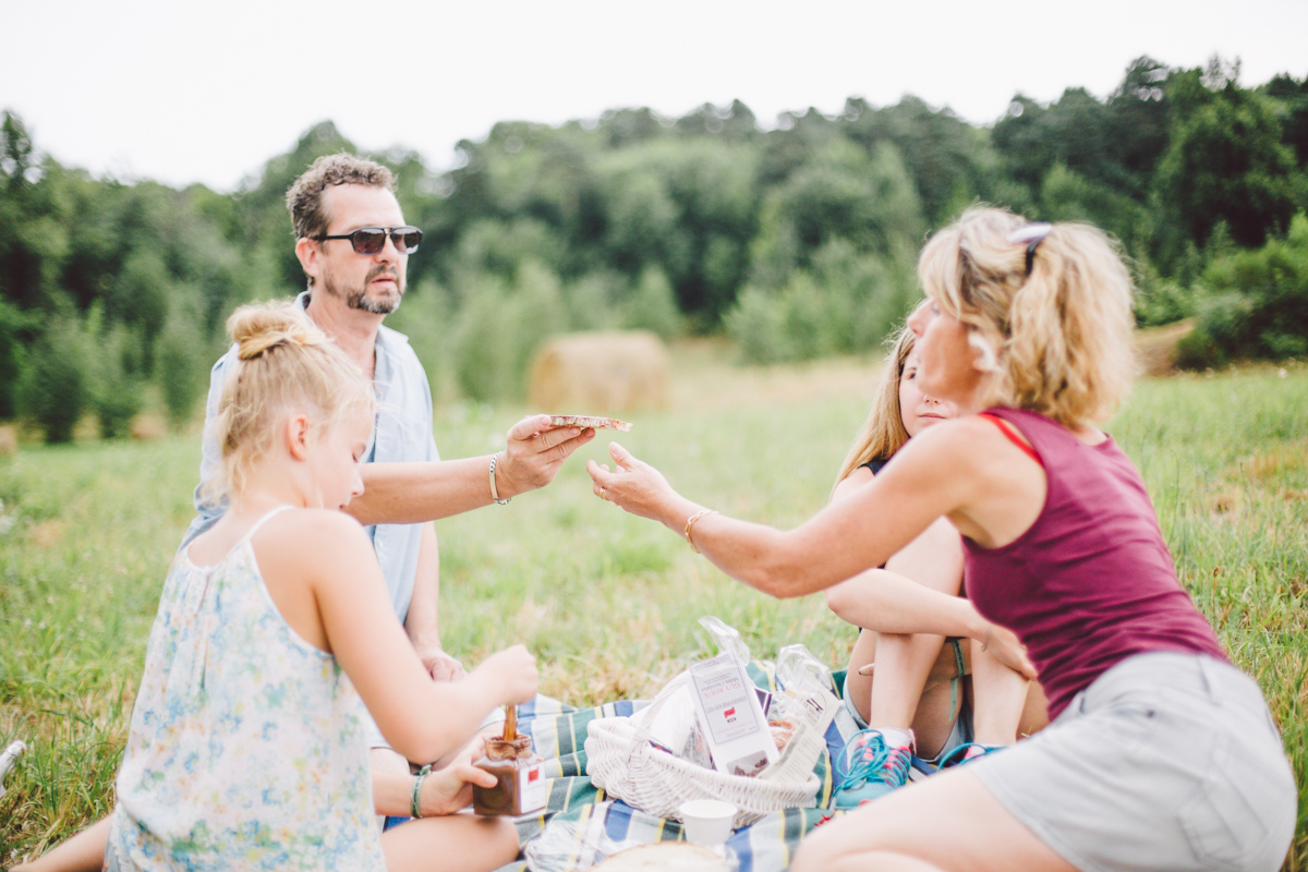 Après plusieurs kilomètres de marche, nous décidons de nous arrêter et de faire un pique-nique pour le goûter. L’endroit est idéal, nous sommes au milieu d’un champ et on s’amuse à grimper sur les bottes de paille !