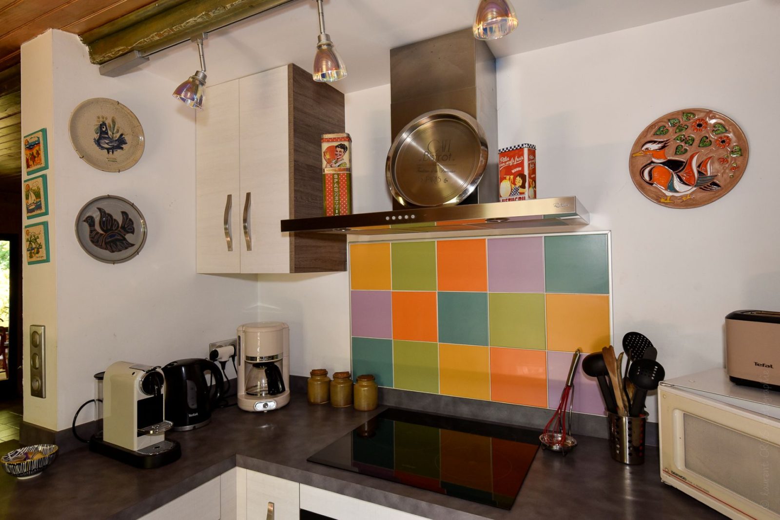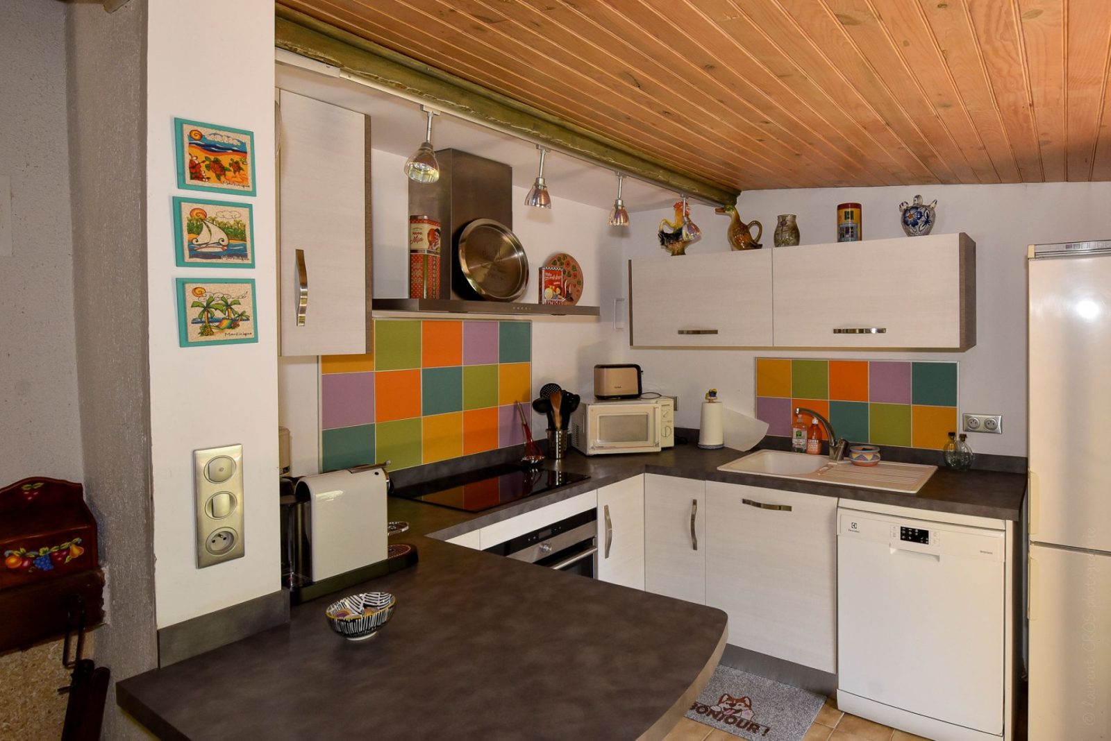 De plain pied, ce chalet comprend : espace vie 40 m2 avec kitchenette/séjour (four et plaque à induction, lave- vaisselle, micro-ondes, congélateur) et coin salon TV couleur, lecteur DVD; canapé convertible en 140), cheminée, salle d'eau avec WC. 1 chambre (7 m2) 1 lit en 140. Jeux de société. Chauffage : cheminée avec insert + convecteur. Location de draps, linge de maison et de toilette.
