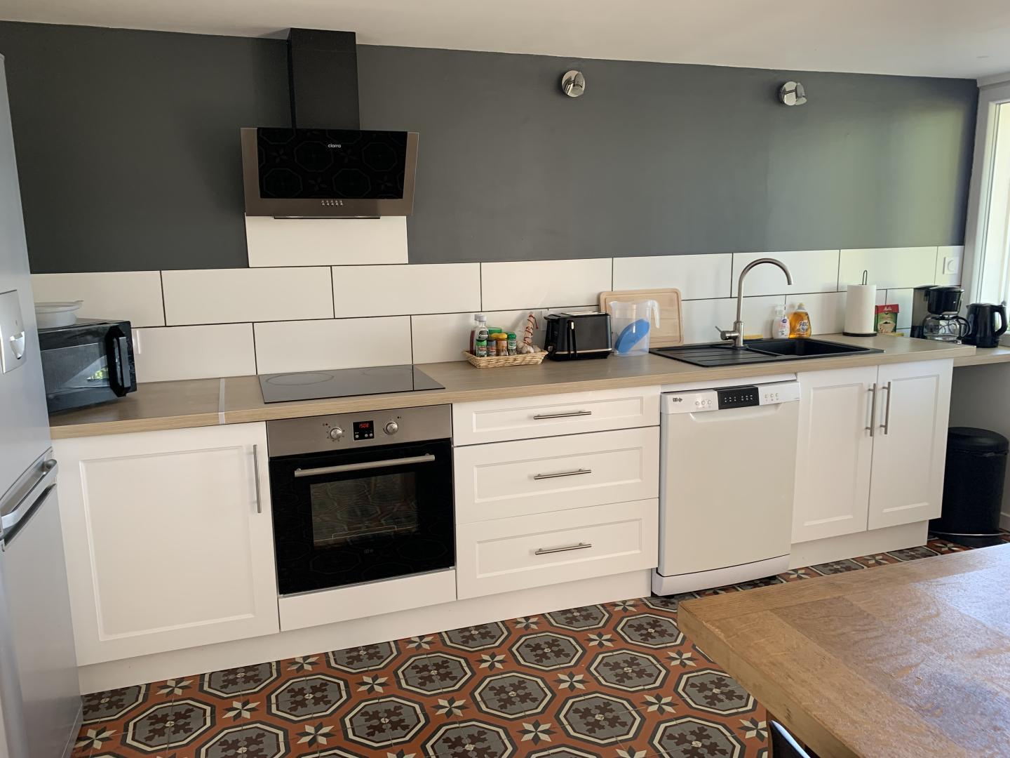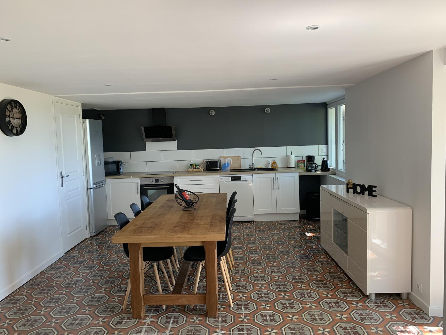 Au rez-de-chaussée du gîte se trouvent une grande pièce à vivre (40m²) avec coin salon (canapé, fauteuils, tv) et cuisine ouverte toute équipée : réfrigérateur, lave-vaisselle, four, plaques de cuisson, micro-onde, bouilloire, cafetière, grille pain... ainsi qu'une buanderie avec wc, lave-linge