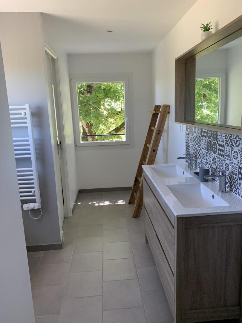 - salle d'eau avec meuble double vasque, douche, wc