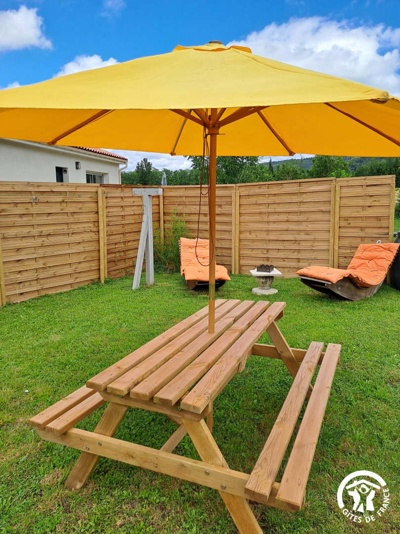 À l'extérieur, profitez de la terrasse avec un salon de jardin agréable. Le jardin privé et clos de 200 m² est idéal pour un moment en famille ou entre amis, avec barbecue, table de pique-nique en bois, bains de soleil en bois et table de ping-pong.