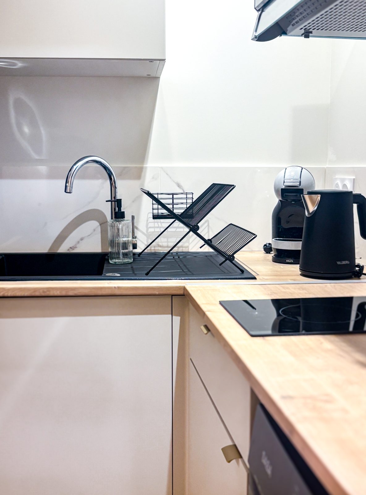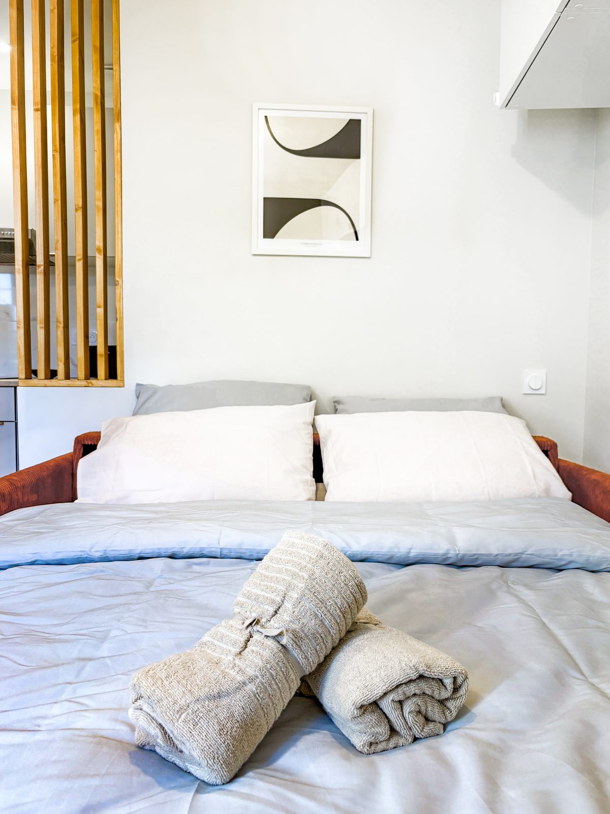 Studio artistique et lumineux de 20 m², idéalement pensé pour une pause créative à Castres. Le canapé couleur brique se transforme en lit haut de gamme, placé sur un pan de mur avec un beau claustra. La cuisine équipée, la salle d’eau en marbre clair et les touches décoratives terracotta créent une ambiance chaleureuse et contemporaine.