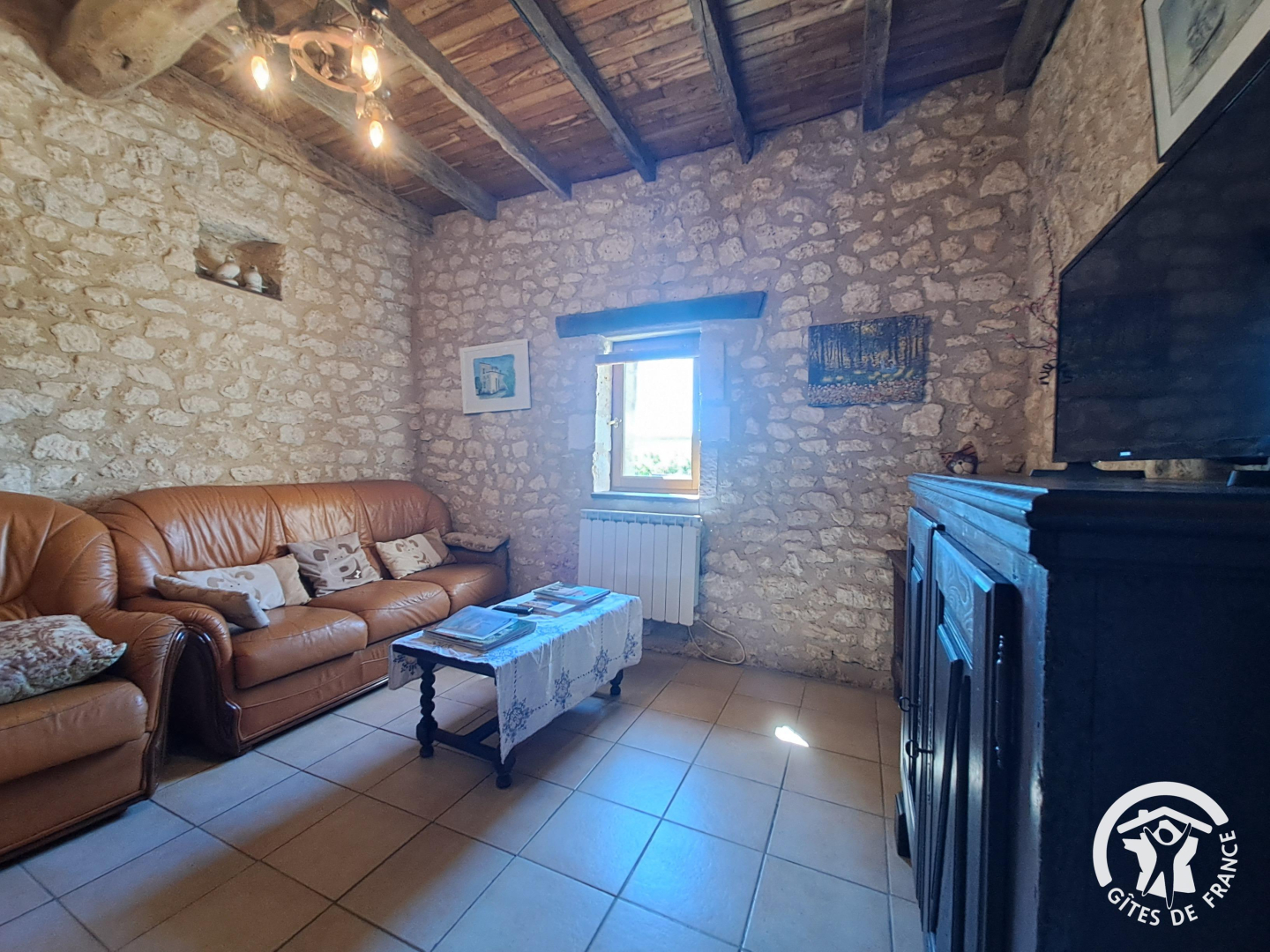 - Salon avec canapé, fauteuil, et tv