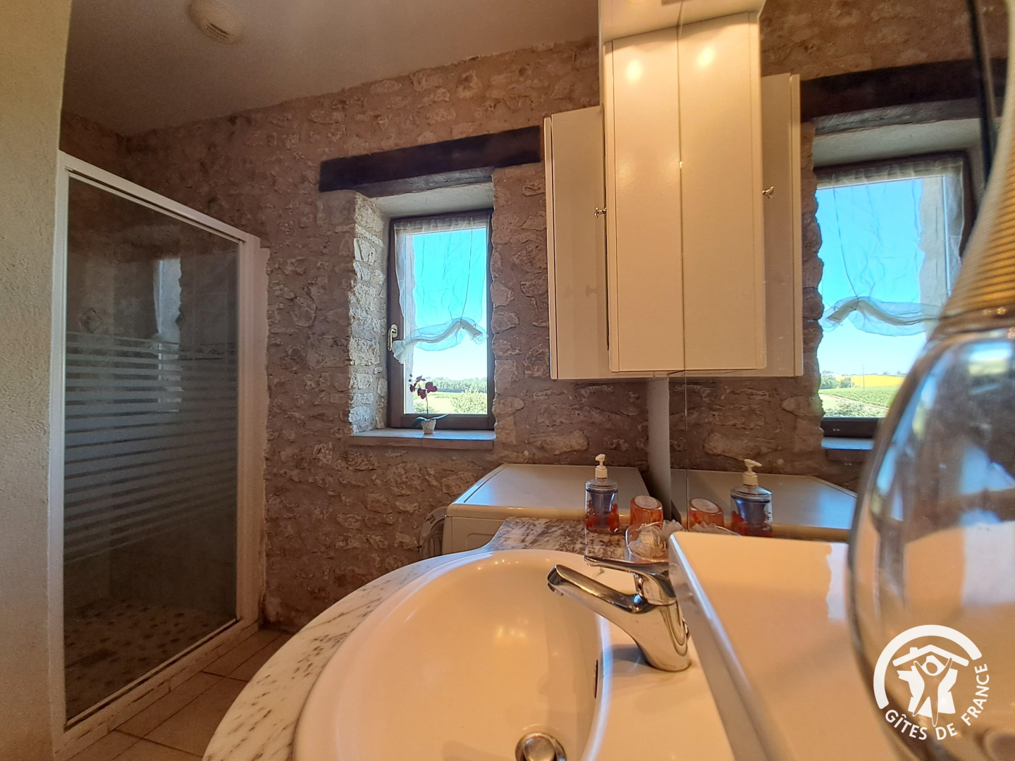 - Salle d'eau avec un lavabo, douche et lave-linge
