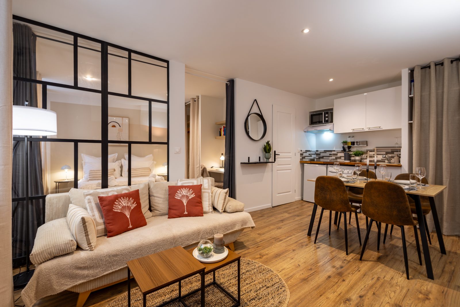 L’espace s’ouvre sur un séjour chaleureux avec une cuisine ouverte.