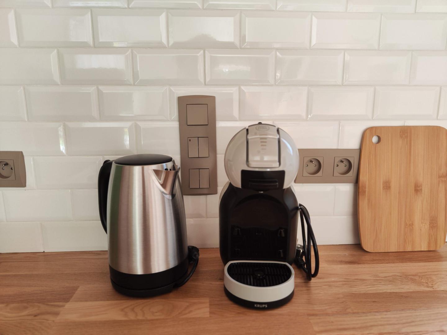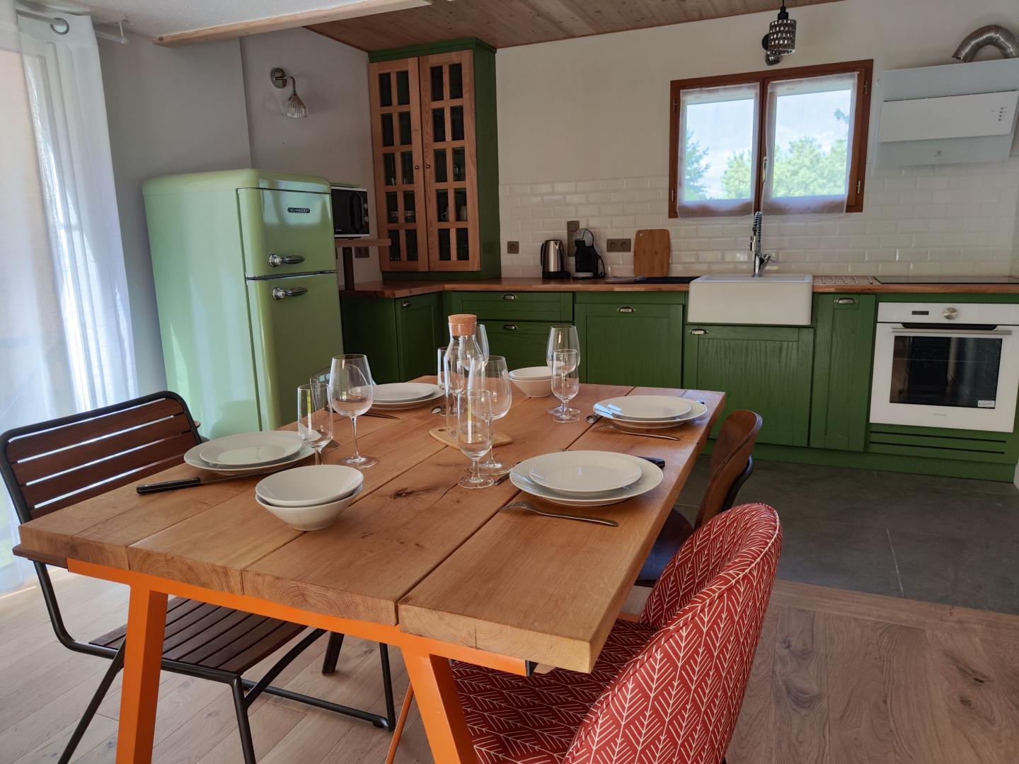 Pensée pour accueillir jusqu'à 5 personnes, la maison propose au rez-de-chaussée une cuisine ouverte entièrement équipée (four, micro-ondes, réfrigérateur, congélateur, lave-vaisselle, cafetière à capsules) donnant sur un espace salon et salle à manger convivial.